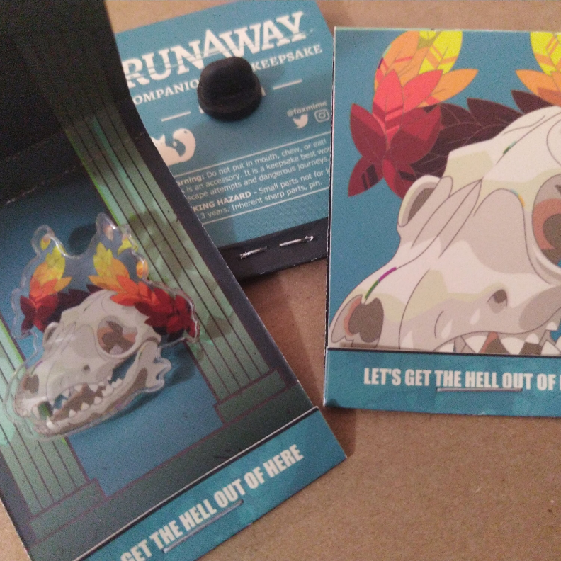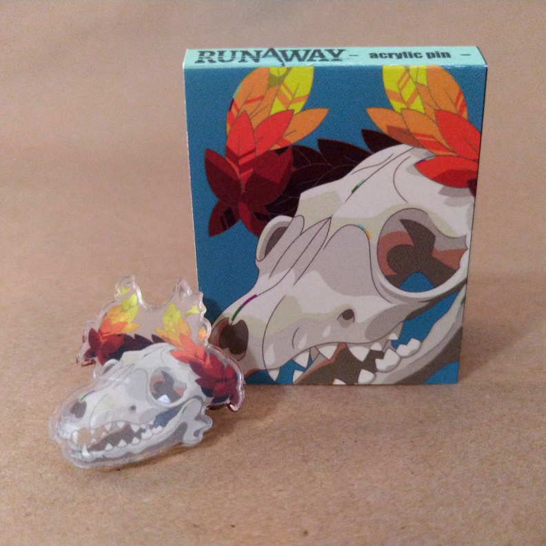 1 acrylic pin; this tough companion keepsake will stick by your side through any situation! The game inspired design shows a simplified fox skull with burning laurels. Its small size makes it easy to equip and tag along on your adventures.