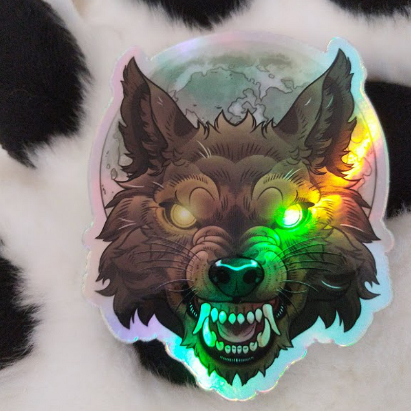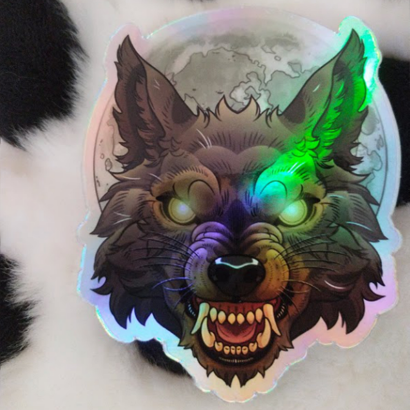 1 die-cut holographic vinyl sticker, 3" big! Features a snarling werewolf before a fullmoon. The shiny holographic surface has a rainbow color effect when the sticker is viewed at different angles.