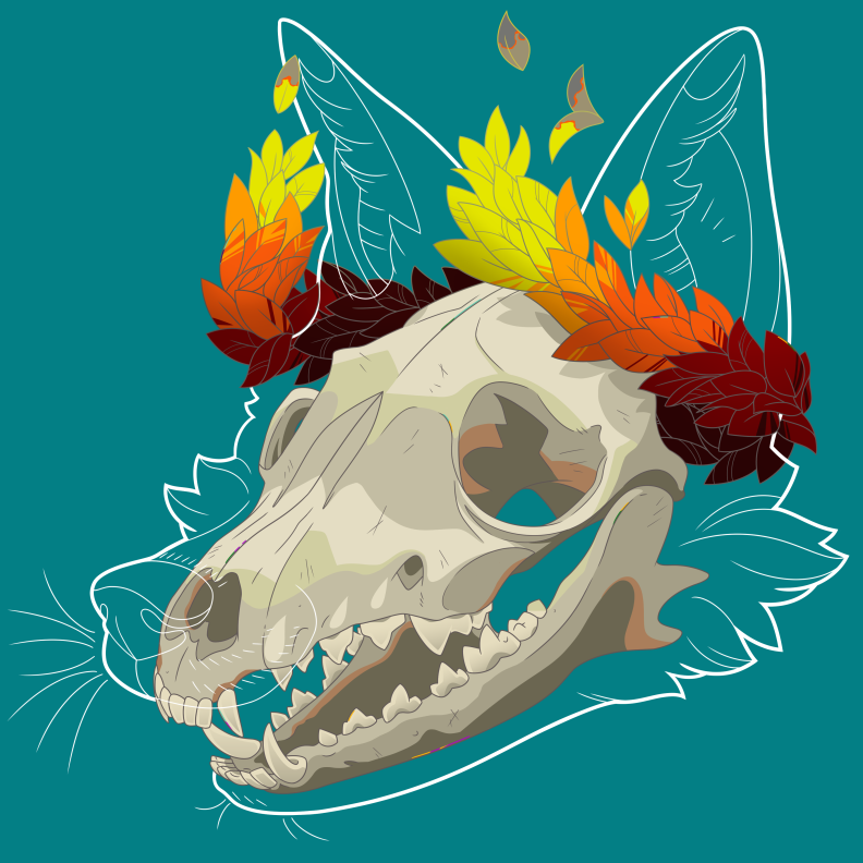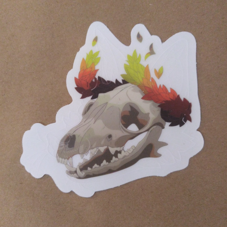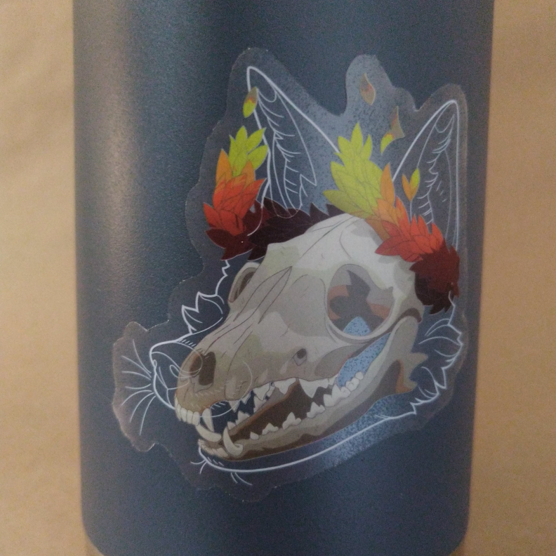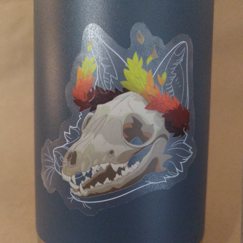 Let's get the hell out of here with this large 3" transparent vinyl sticker! The design is a game inspired fox skull with burning laurels, bearing a ghostly vulpine outline. For best results, show your spirit on a dark surface! Note: display canister is not included.