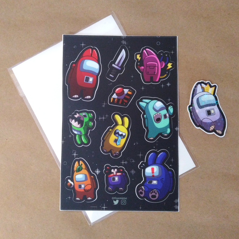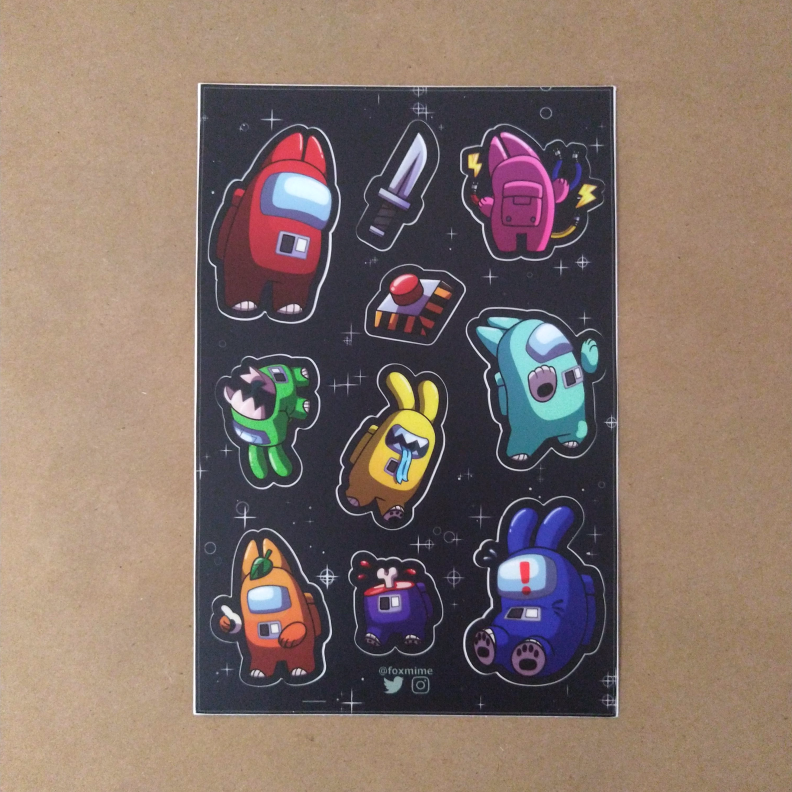 These stickers are lookin’ sus. This game inspired vinyl sticker sheet features a mix of foxes and rabbits in colorful space suits.The smallest sticker in the sheet is about an 1”, perfect for decorating a workstation, heh.