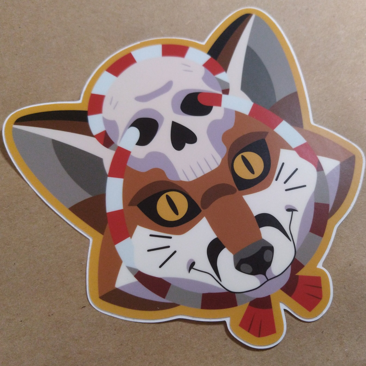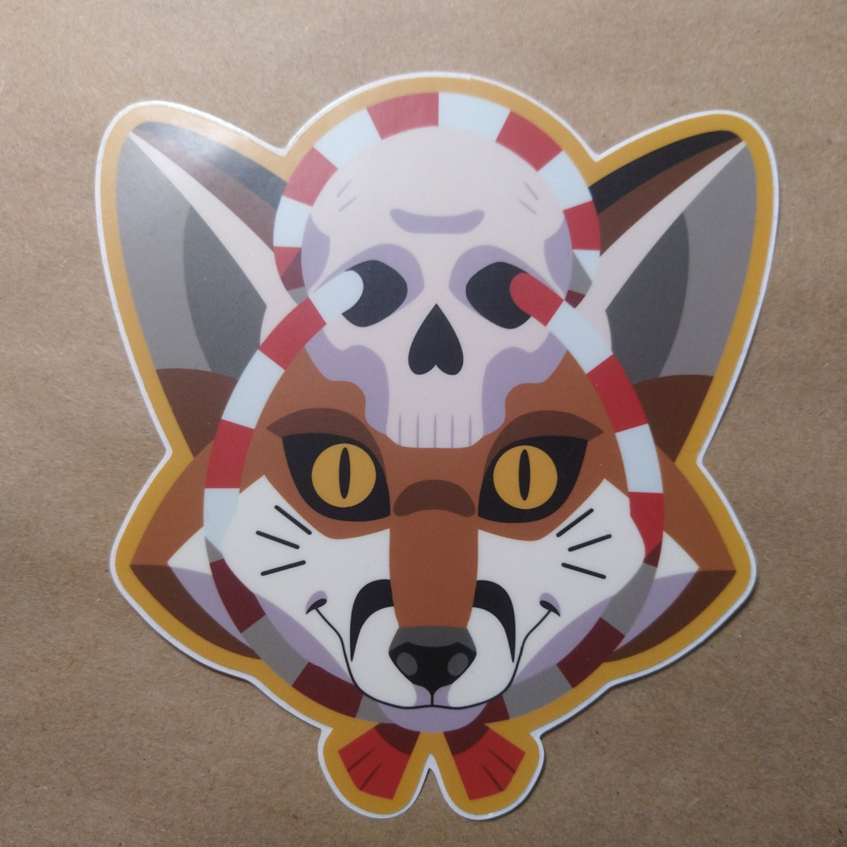 Beware of this vulpine mischief maker! Item is 1 die-cut vinyl sticker that is 4" big! This sticker shares the same kitsune-inspired design as its 4" patch version. Works a treat for surfaces you want to decorate but aren't suitable for iron-on patches, heh heh.