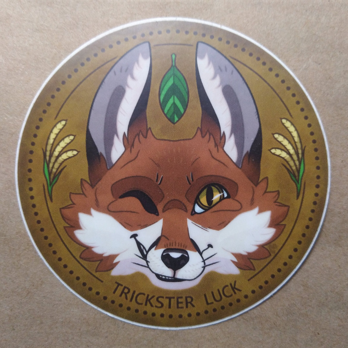 1 circle-cut, 3" vinyl sticker of a winking fox on an antiqued-brass colored background. This design was originally imagined as a type of foxy challenge coin, but I love stickers too much!