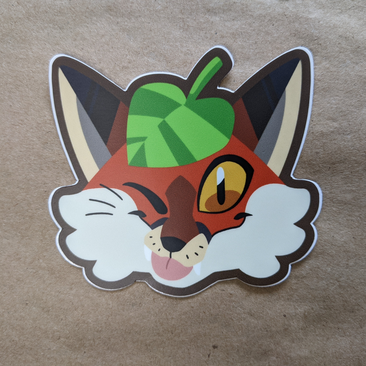 A 3" die-cut vinyl sticker of a sly fox wearing a leaf as a hat. This is inspired by folk tales of magic foxes (kitsune) who would place a leaf on their head to help them transform or shapeshift, usually to have fun or cause mischief.