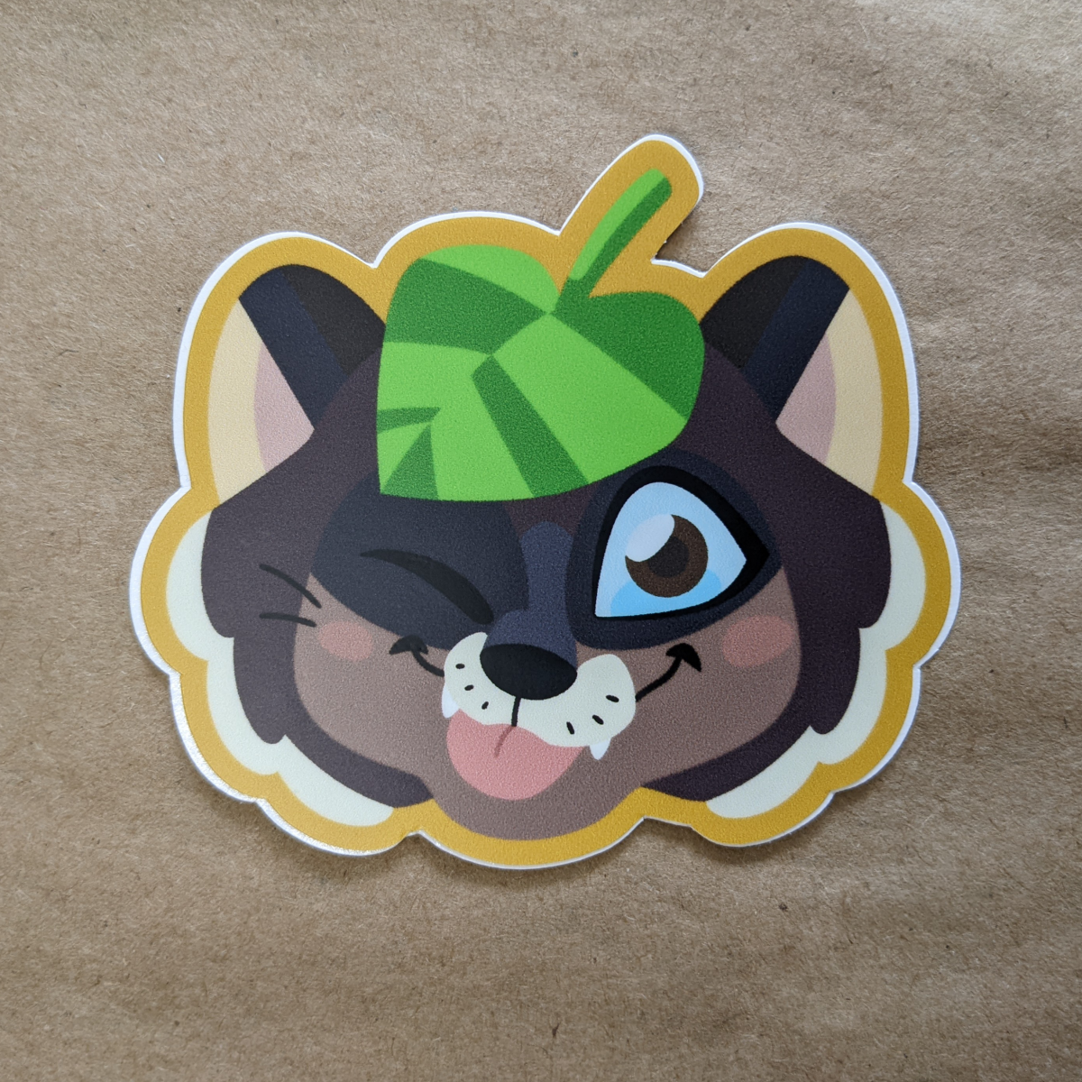 A 3" die-cut vinyl sticker of a playful tanuki wearing a leaf as a hat. This is inspired by folk tales of magic tanuki (raccoon dogs) who would place a leaf on their head to help them transform or shapeshift, usually to have fun or cause mischief.